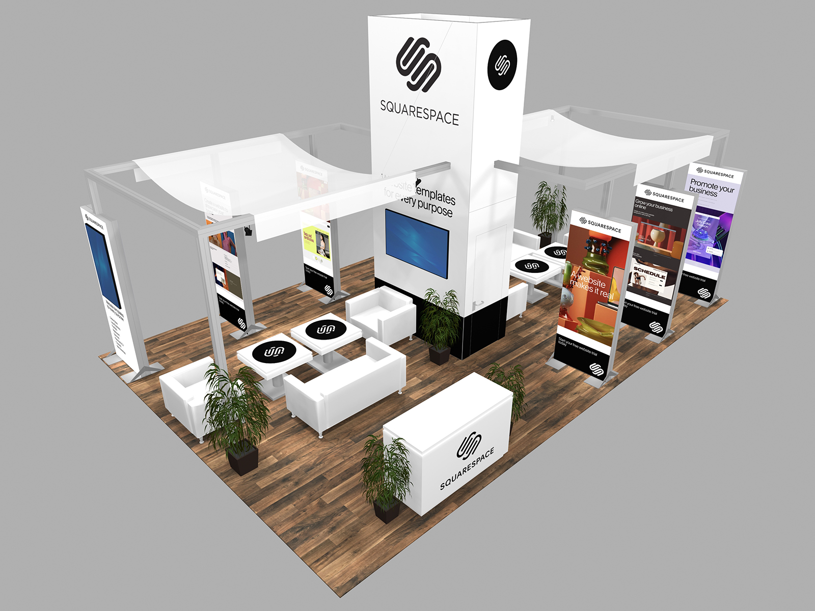 Comfortable and productive are rarely used together to describe a trade show exhibit design. Yet, the VK-5216, VK-5218 and VK-5218 series of 20 x 30 islands are perfect examples of how design can blend these two concepts into a stylish booth. They feature large format fabric graphics with backlighting, demo stations, and multiple monitors, The VK-5216 and VK-5217 have ceiling canopies with scrim fabric, whereas the VK-5218 has a rectangle hanging sign for increased visibility.