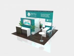 Bold backlit graphics with practical accessories are the hottest trend in island designs. The VK-5214 and VK-5215 strike a balance with backlit graphics, reception and demo counters, and casual seating. The SuperNova lightboxes are double-sided for maximum exposure and engineered for large monitors. The reception counter includes LED accent lights and storage. Along the four corners, there are demo stations and casual table seating. There's even a fun coffee bar to encourage attendees to stop, chat, and linger.