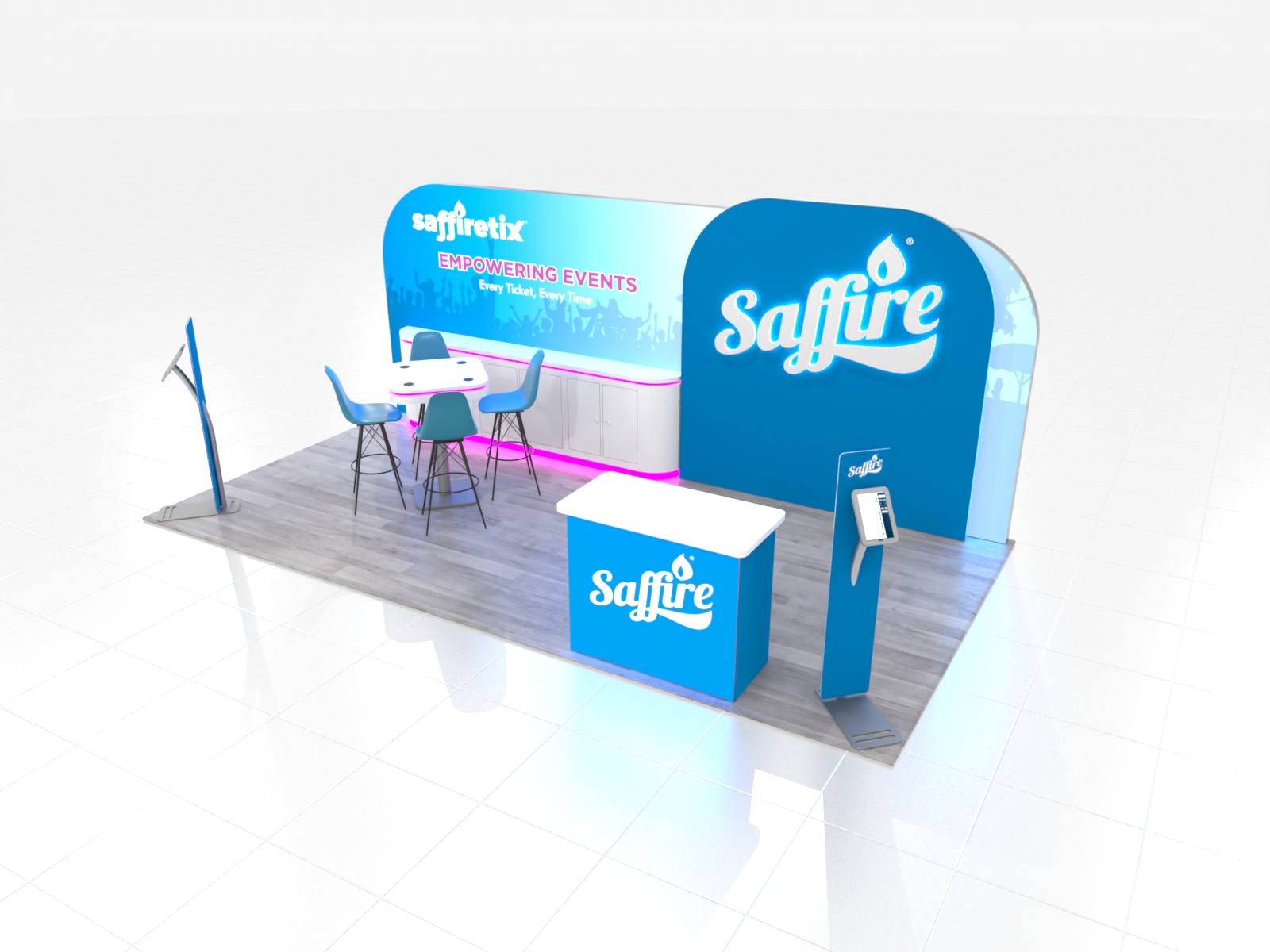 And while the LED lights and backlit graphics provide pizzazz, the reconfigurable inlines are also functional with extensive counters, locking storage, and monitor mounts. There’s even a wireless charging table for meetings and iPad stands for registration, lead retrieval, or product information. Both designs allow for ample space for attendees and booth staff to interact and conduct business.