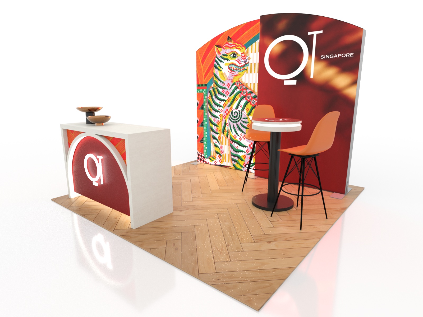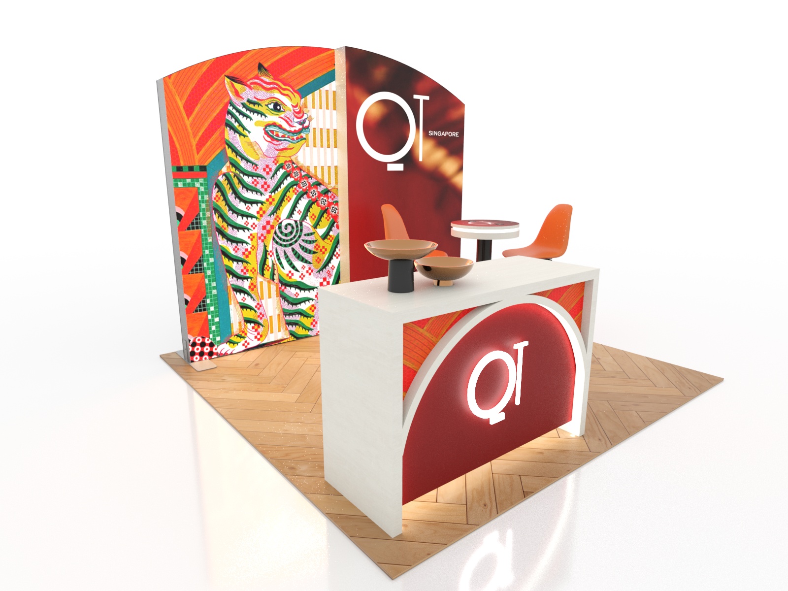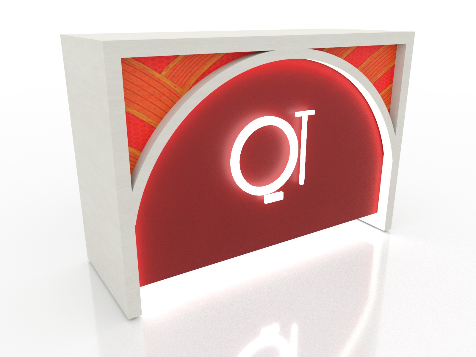 The VK-1138 and VK-4058 SuperNova Lightbox design is both attractive and welcoming. The large SEG fabric graphic lightbox attracts attention, while the seating and product display invite trade show attendees to linger. The understated design includes halo lighting, an artificial wall, monitor mount, and generous storage in two counters.