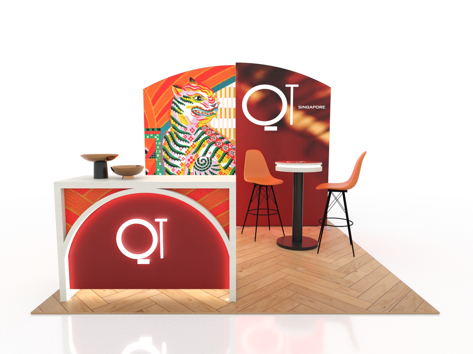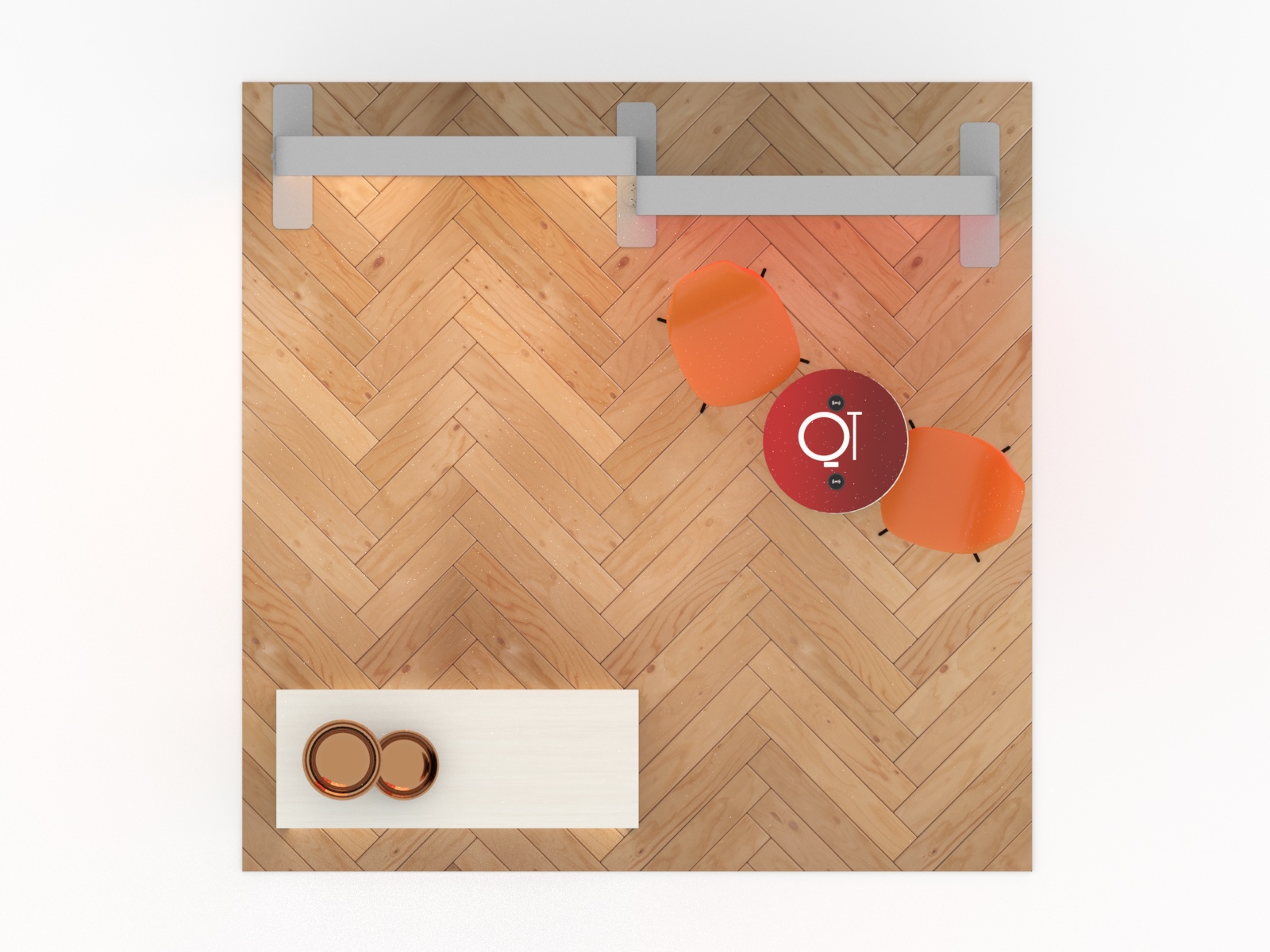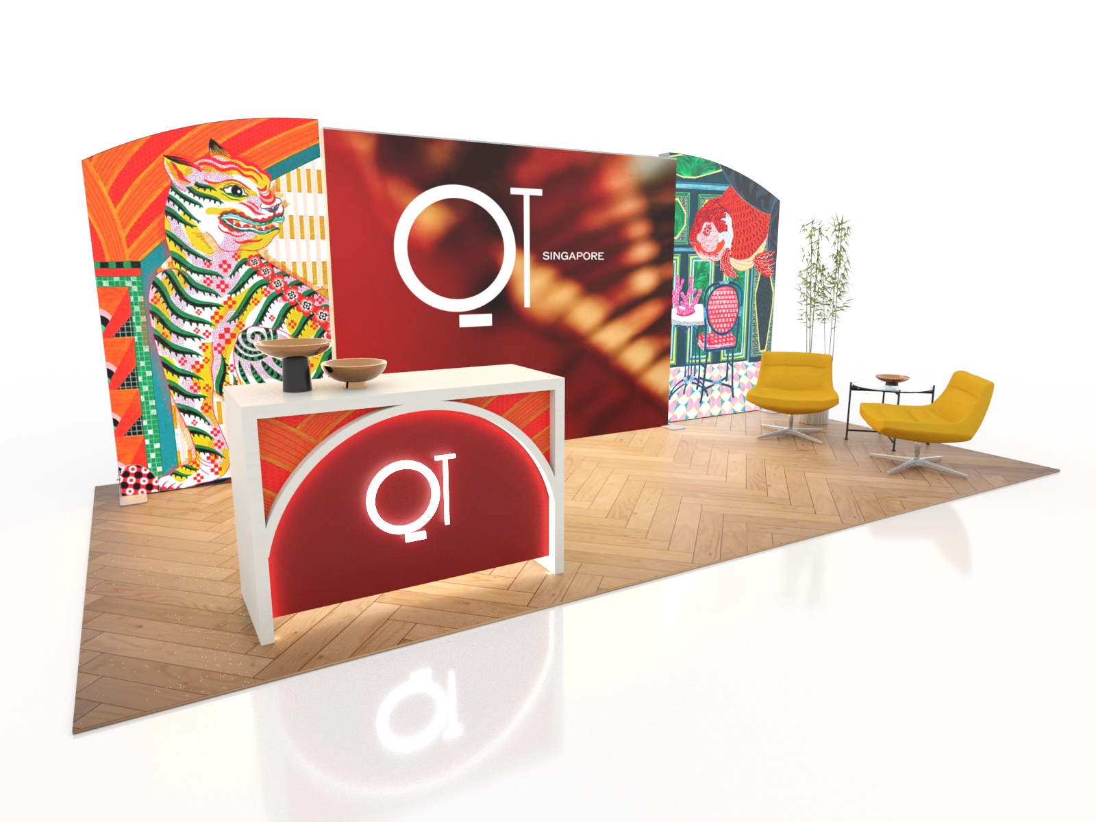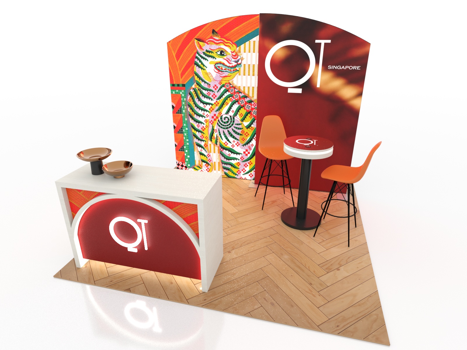 The VK-1138 and VK-4058 SuperNova Lightbox design is both attractive and welcoming. The large SEG fabric graphic lightbox attracts attention, while the seating and product display invite trade show attendees to linger. The understated design includes halo lighting, an artificial wall, monitor mount, and generous storage in two counters.