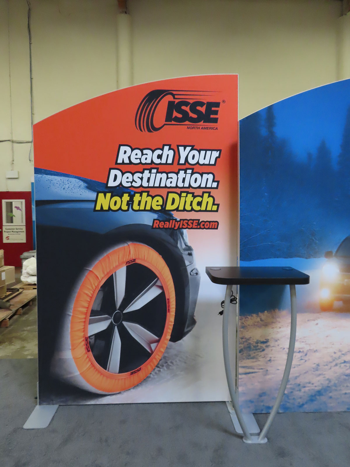 SYK-2006 Symphony Portable Modular Display with SEG Fabric Graphics, Backwall Workstation with Wireless Charging Pads, and LED Stem Lights SYK-2006 Symphony Portable Modular Display -- View 2 SYK-2006 Symphony Portable Modular Display -- View 3
