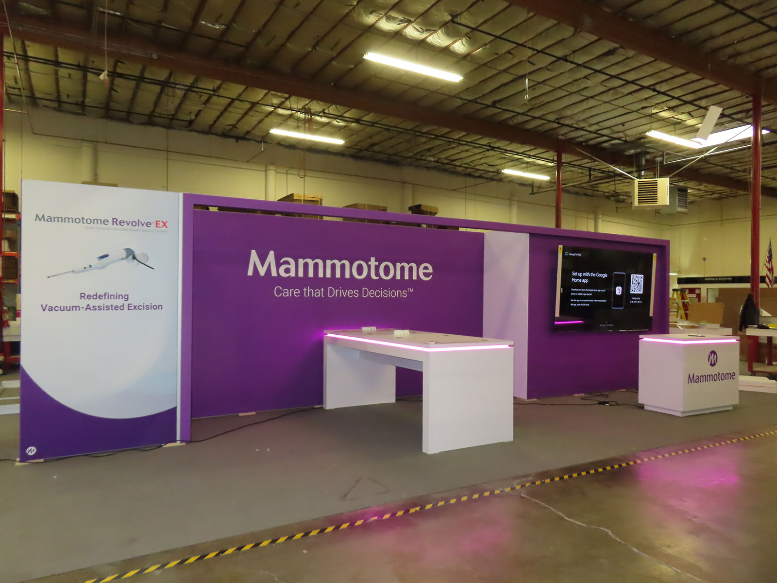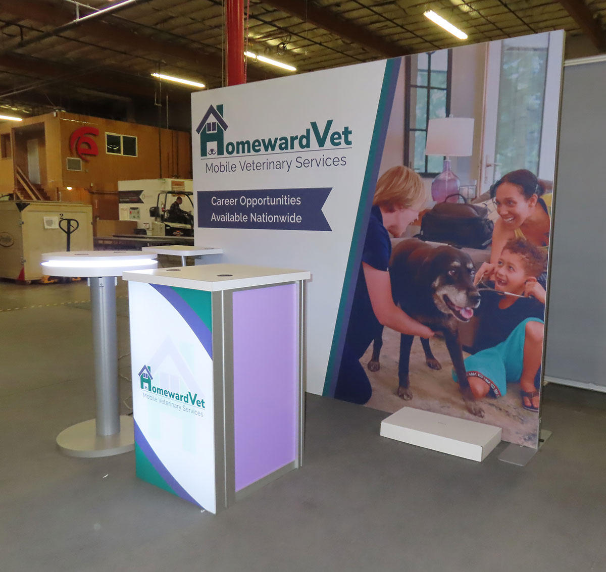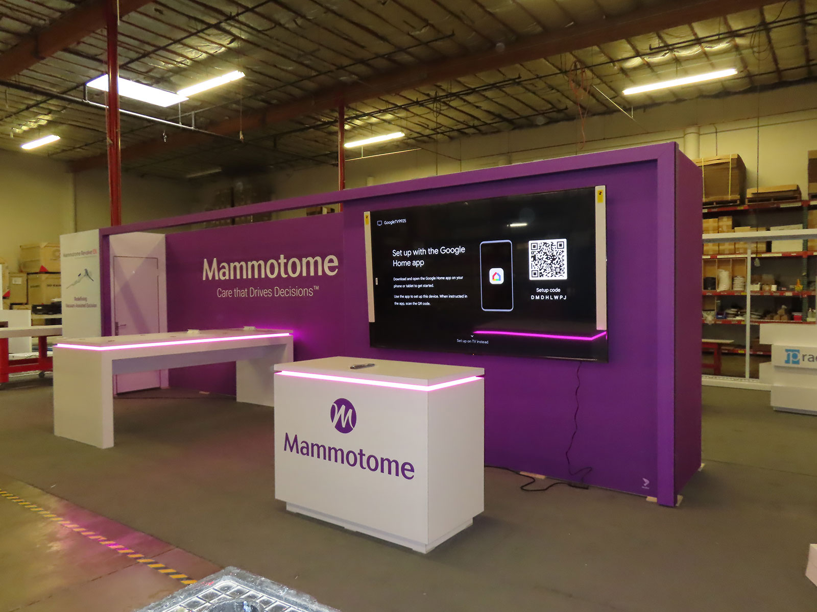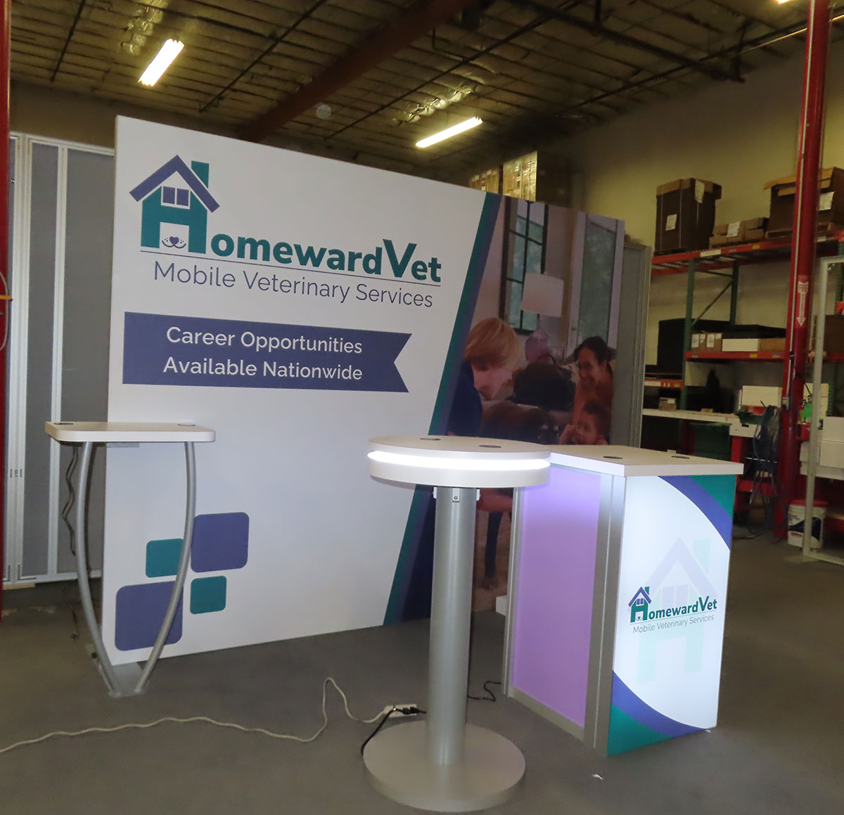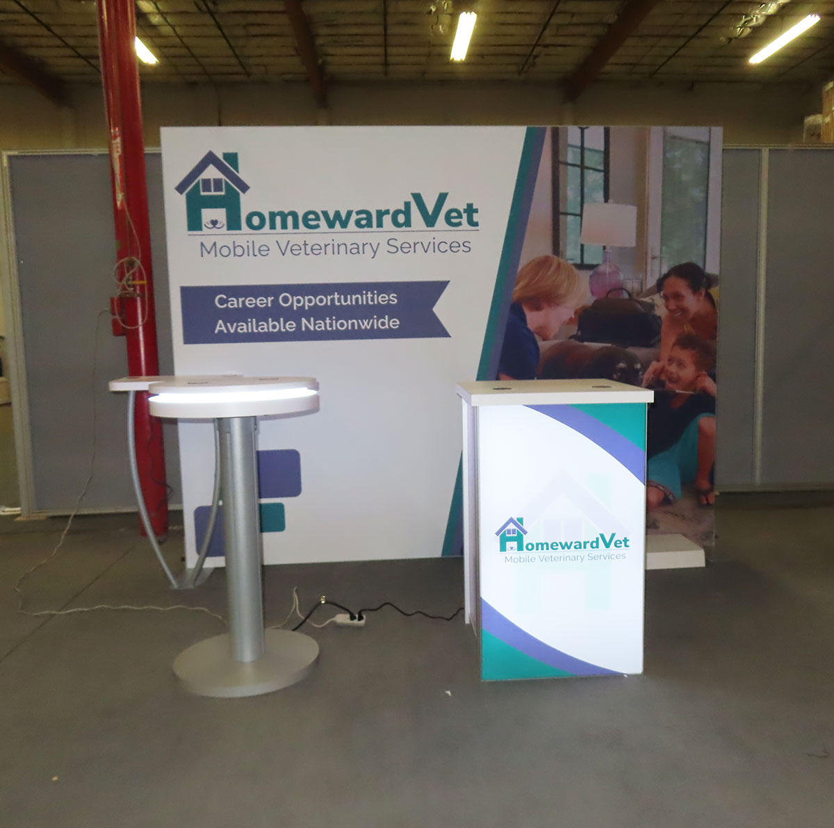 Custom Inline Exhibit with SuperNova Backlit Lightboxes, (4) Product Shelves, Storage Closet, Fabric and Direct Print Graphics, Reception Counter w/ Open Storage, and Counter w/ Locking Storage and Wireless Charging Pads [ORD-69079]