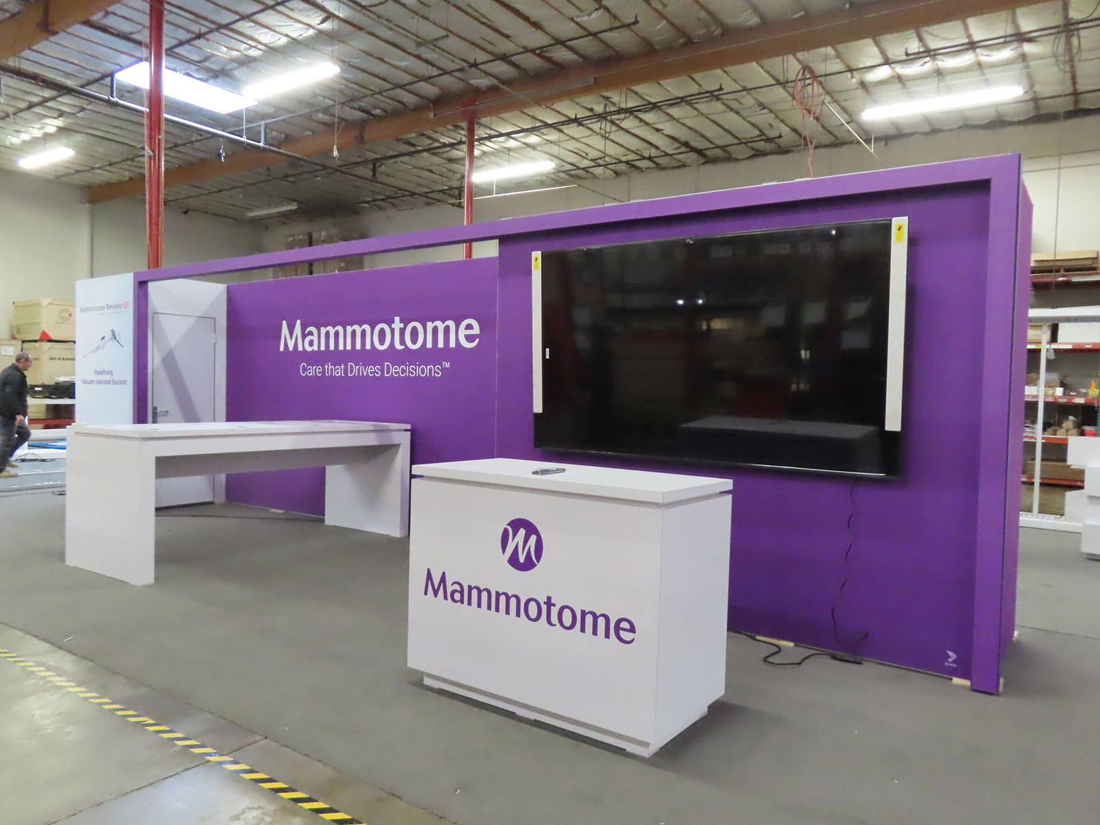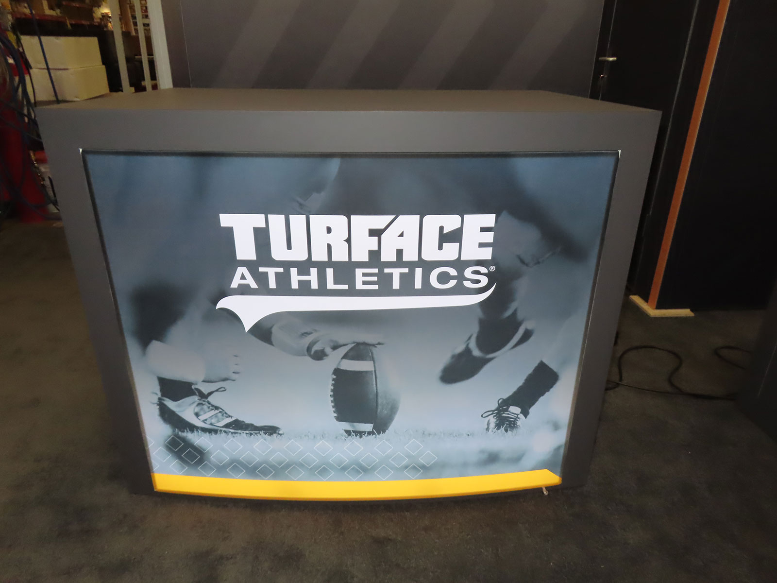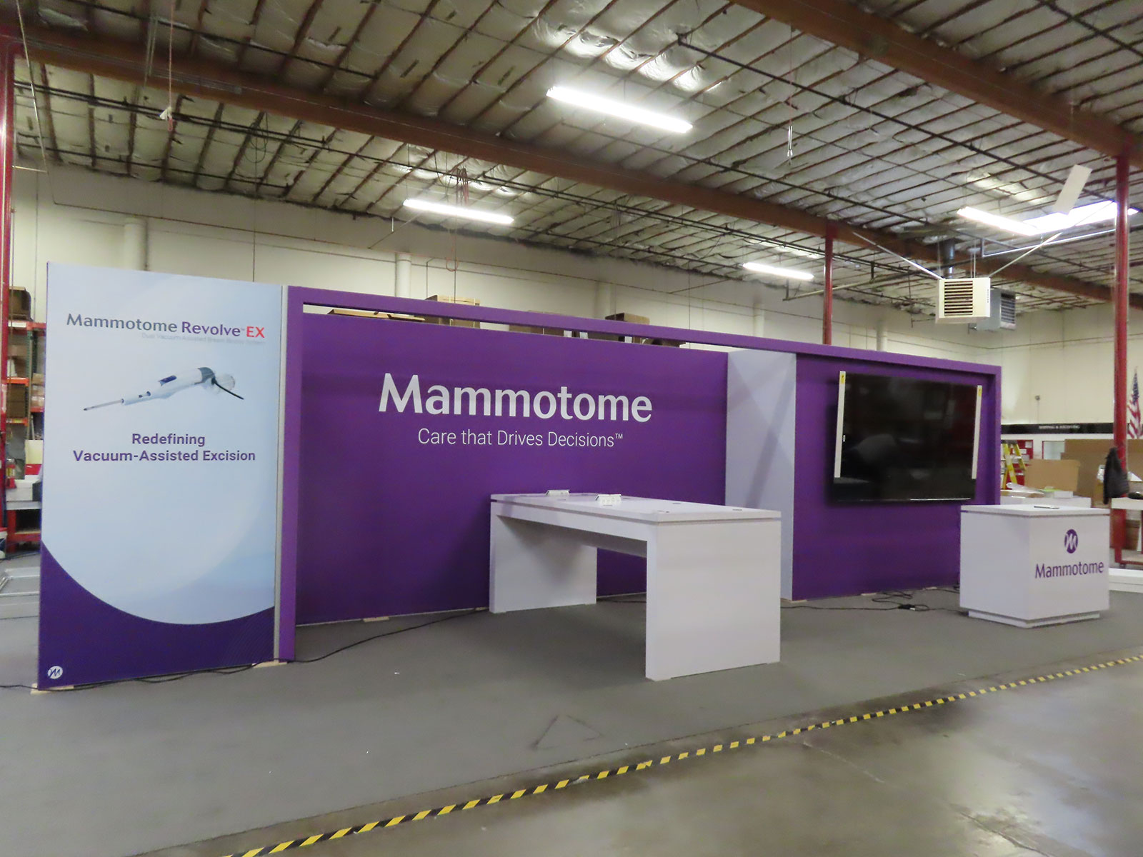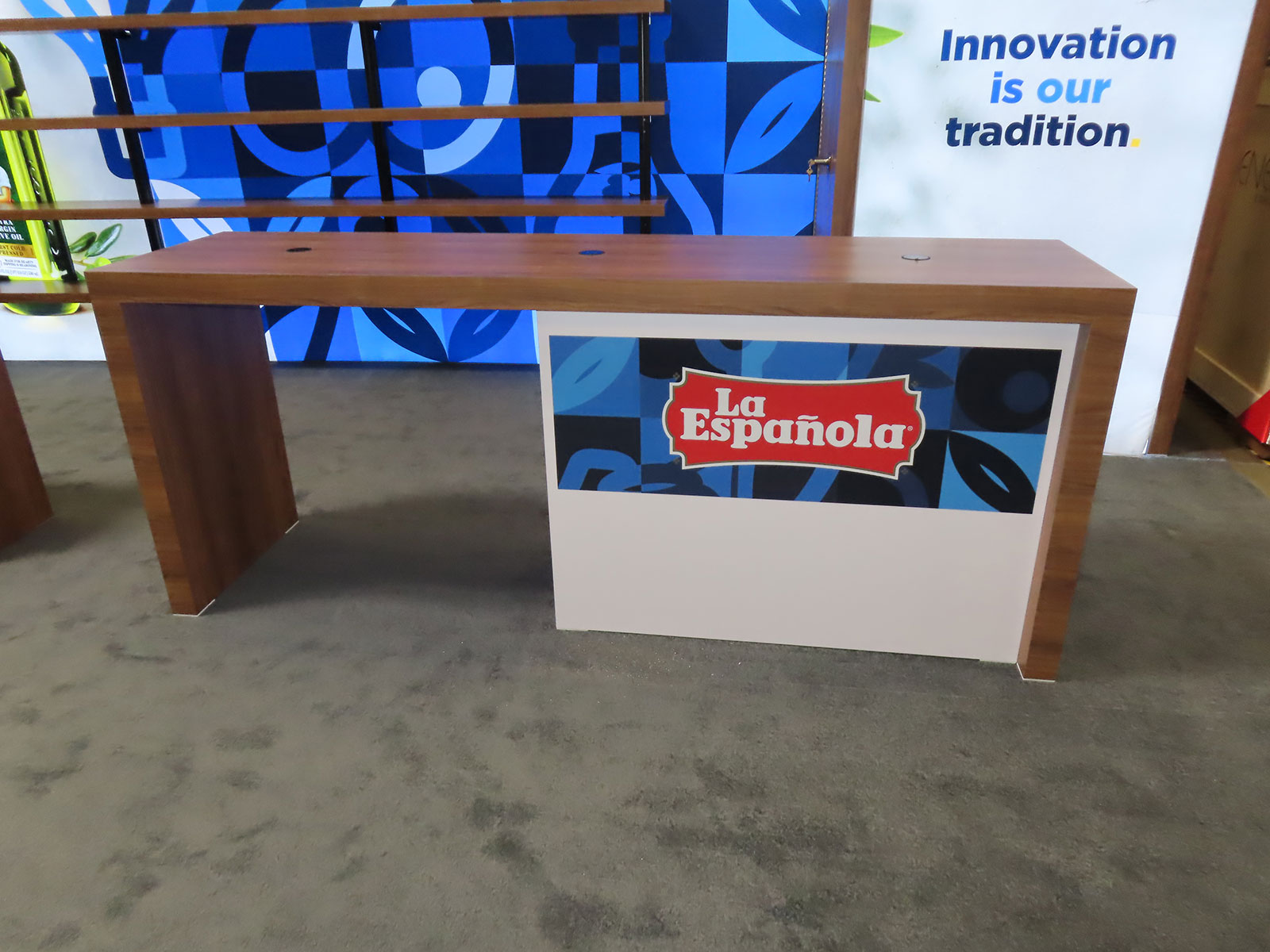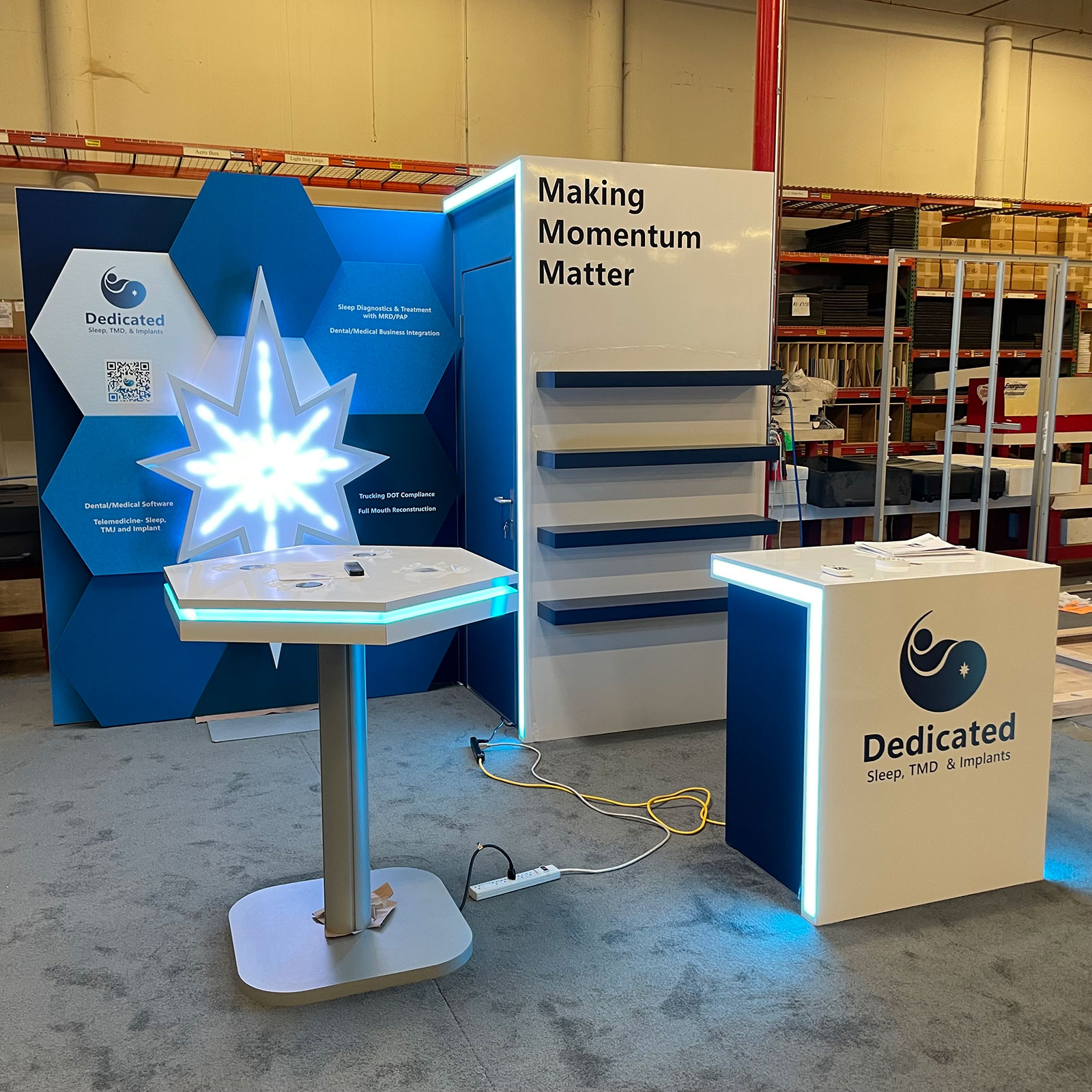 Custom Inline Exhibit with SuperNova Backlit Lightboxes, (4) Product Shelves, Storage Closet, Fabric and Direct Print Graphics, Reception Counter w/ Open Storage, and Counter w/ Locking Storage and Wireless Charging Pads [ORD-69079]