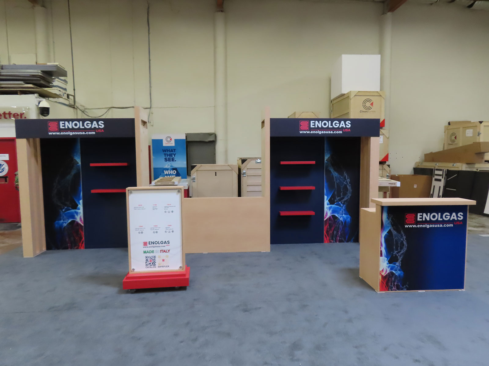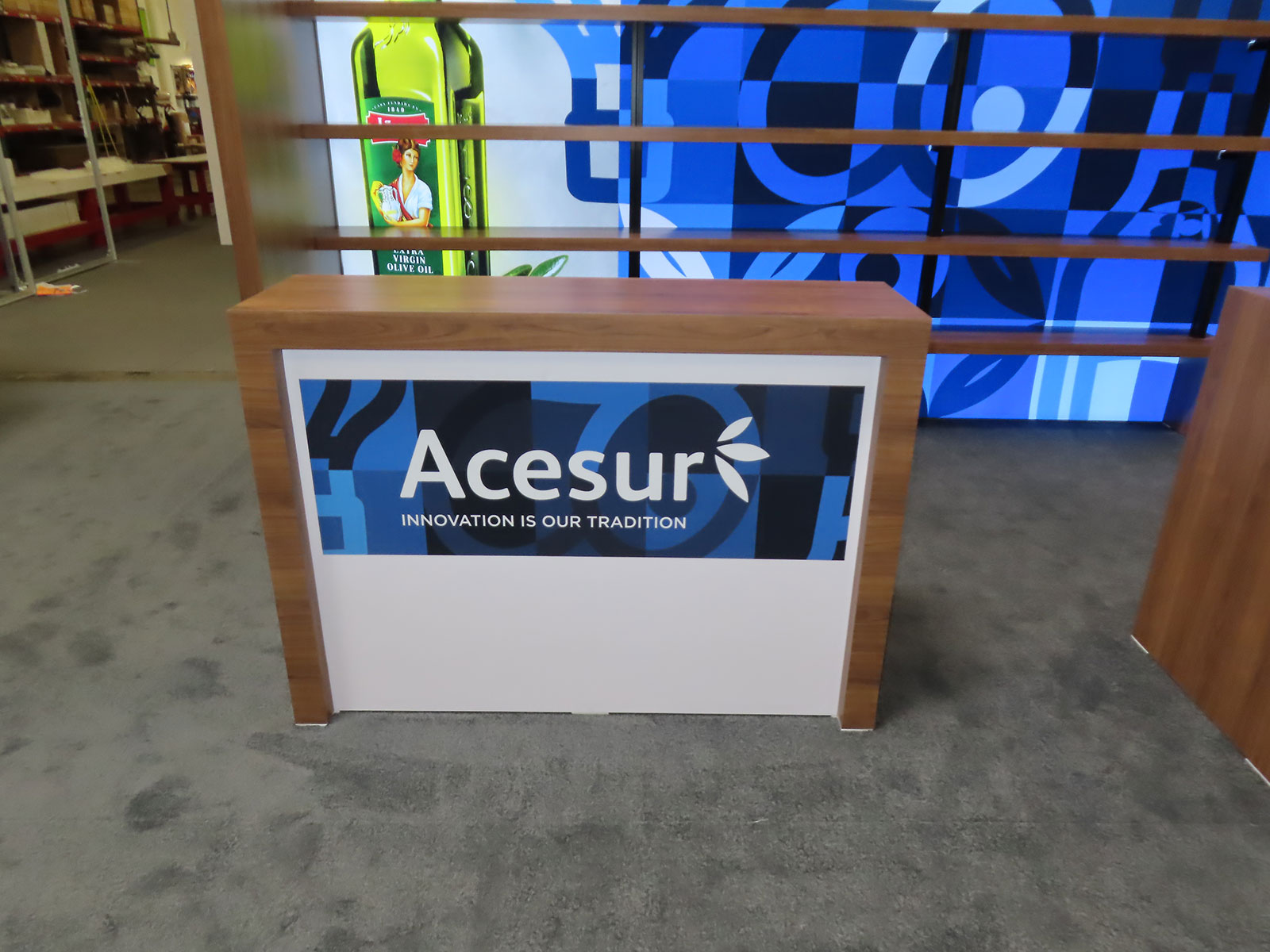 Modified ECO-2038 Sustainable Exhibit with Shelves, Locking Closet, Lightbox, SEG Fabric Graphics, Monitor Mount, and MOD-1590 Backlit Reception Counter with Locking Storage [ORD-69141]