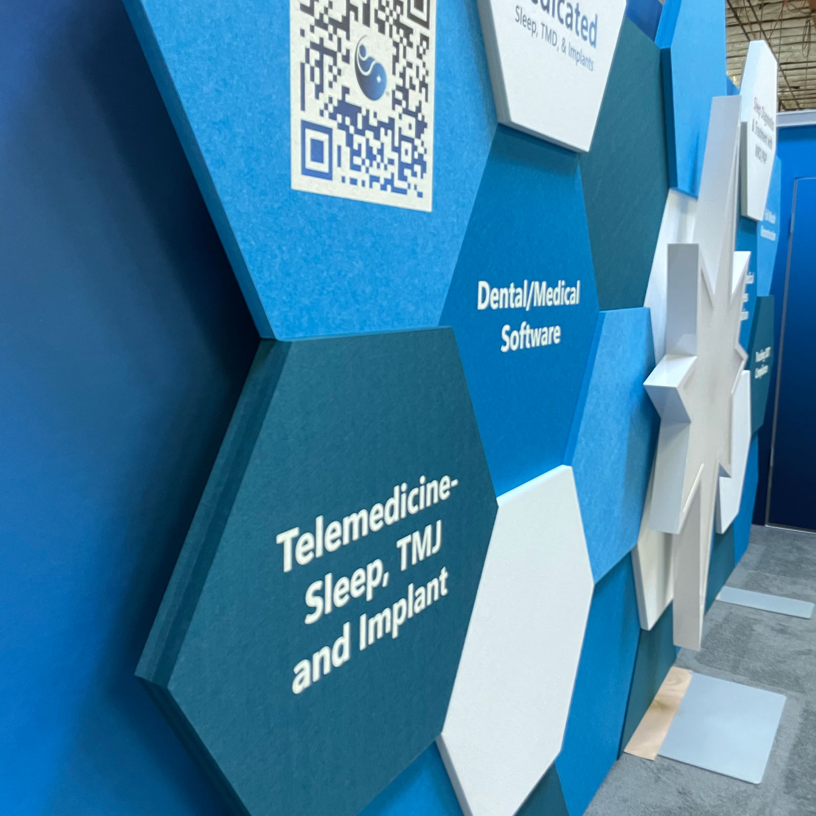 Reconfigurable Gravitee Custom Inline with SEG Fabric Graphic and Printed Hexagon Felt Graphics, LED Accent Lights, Magnetic Attachments, Shelves, Locking Closet, Reception Counter w/ Locking Storage, and Modified MOD-1464 Wireless Charging Table Reconfigurable Gravitee Custom Inline with SEG Fabric  and Printed Hexagon Felt Graphics -- View 2 Reconfigurable Gravitee Custom Inline with SEG Fabric  and Printed Hexagon Felt Graphics -- View 3 Reconfigurable Gravitee Custom Inline with SEG Fabric and Printed Hexagon Felt Graphics -- View 4 Reconfigurable Gravitee Custom Inline with SEG Fabric and Printed Hexagon Felt Graphics -- View 5 Reconfigurable Gravitee Custom Inline with SEG Fabric and Printed Hexagon Felt Graphics -- View 6 10 x 10 Version