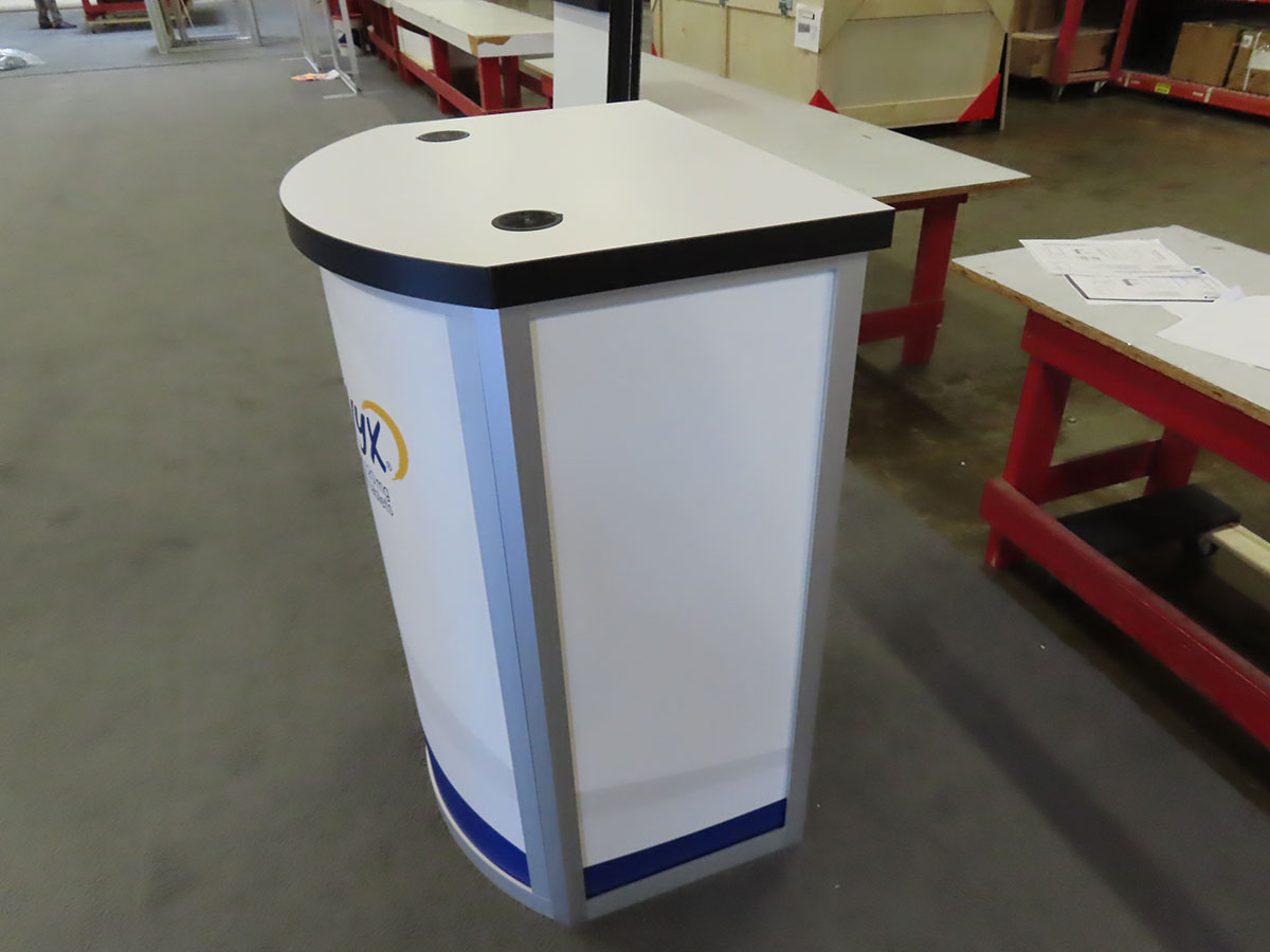 SYK-2006 Symphony Portable Modular Display with SEG Fabric Graphics, Backwall Workstation with Wireless Charging Pads, and LED Stem Lights [ORD-69134]
