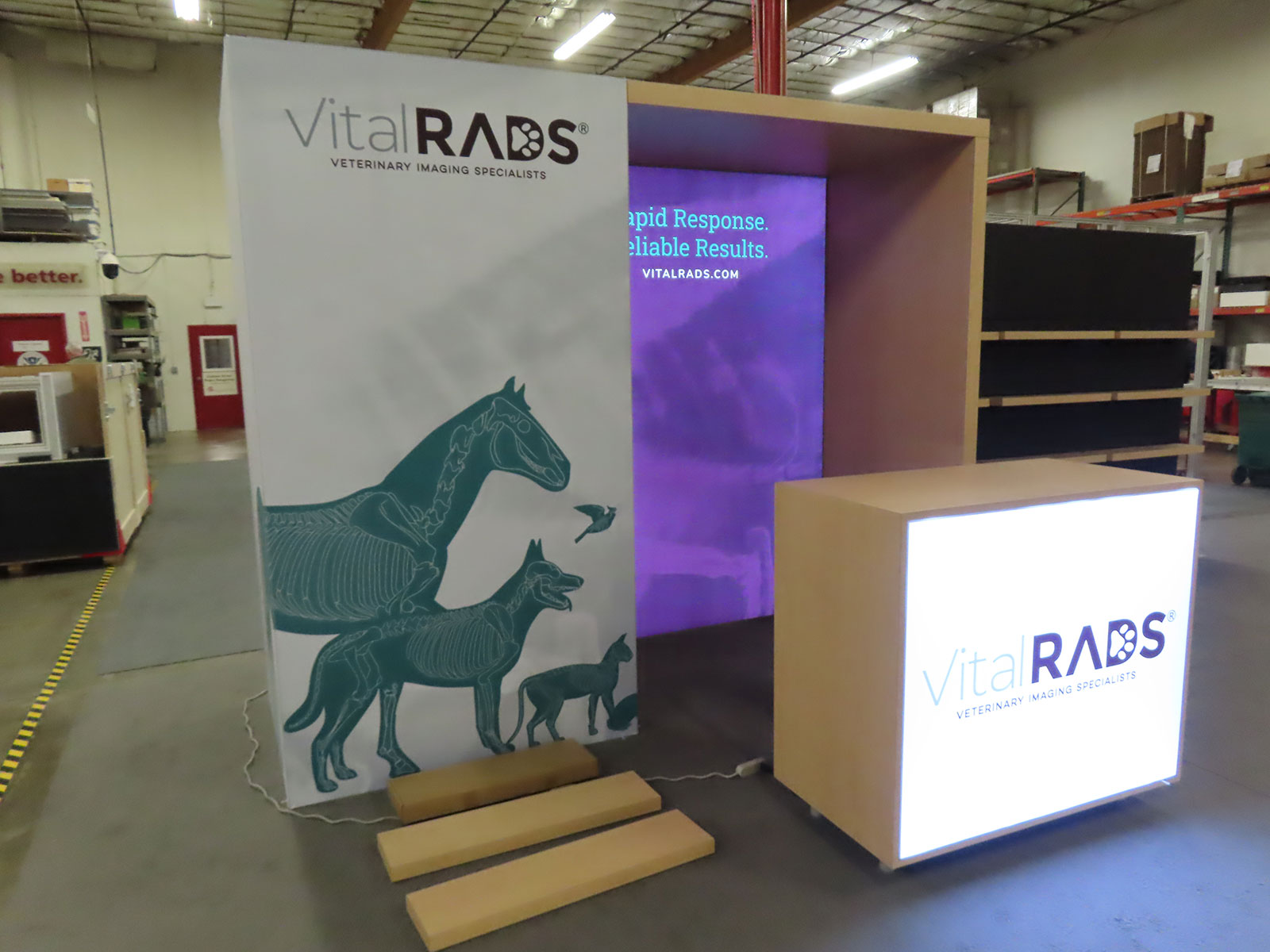 Modified VK-4044 Reconfigurable Inline Exhibit with Shelves, Monitor Mount, Backlit Fabric Graphics, Canopy, Modified MOD-1726 Counter with Locking Storage, and Product Display. Shown w/o LED Video Tiles (Center Section) [ORD-69091]